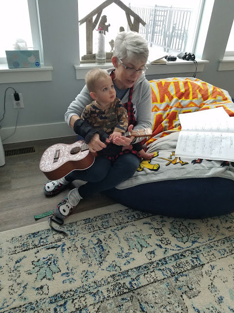 Brigham came to help his Grandma play the Ukelele. I love Brigham! And also you can't see the mountain behind me because we were in a cloud off and on today. It's really kind of awesome to look out our big windows and only see clouds - unless you get close - and then usually you can see the yard.